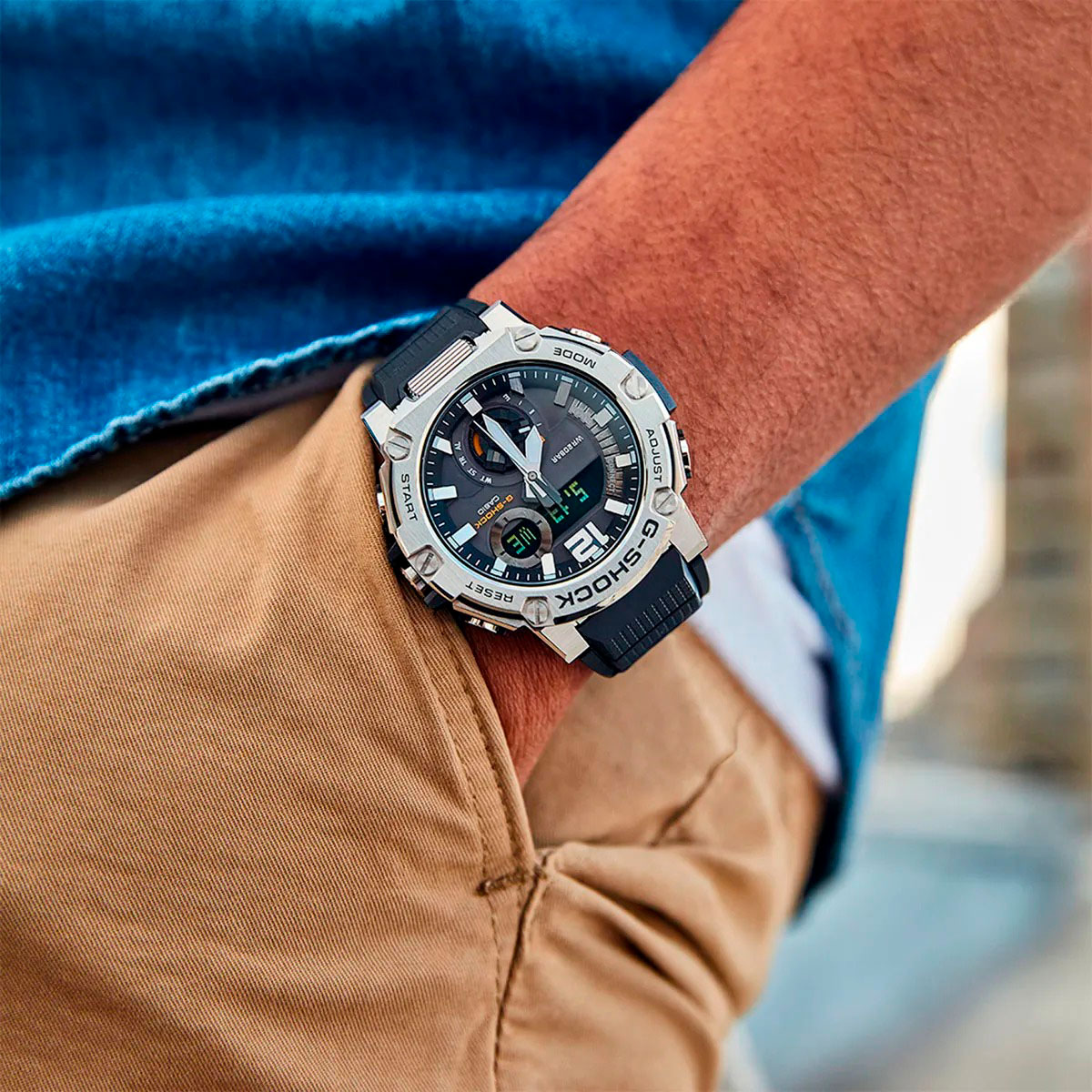 Сочетание нержавеющей стали и смолы, армированной углеродным волокном, поддерживает стабильность часов и обеспечивает больший комфорт при ношении. - Ремешок из полимерного материала.